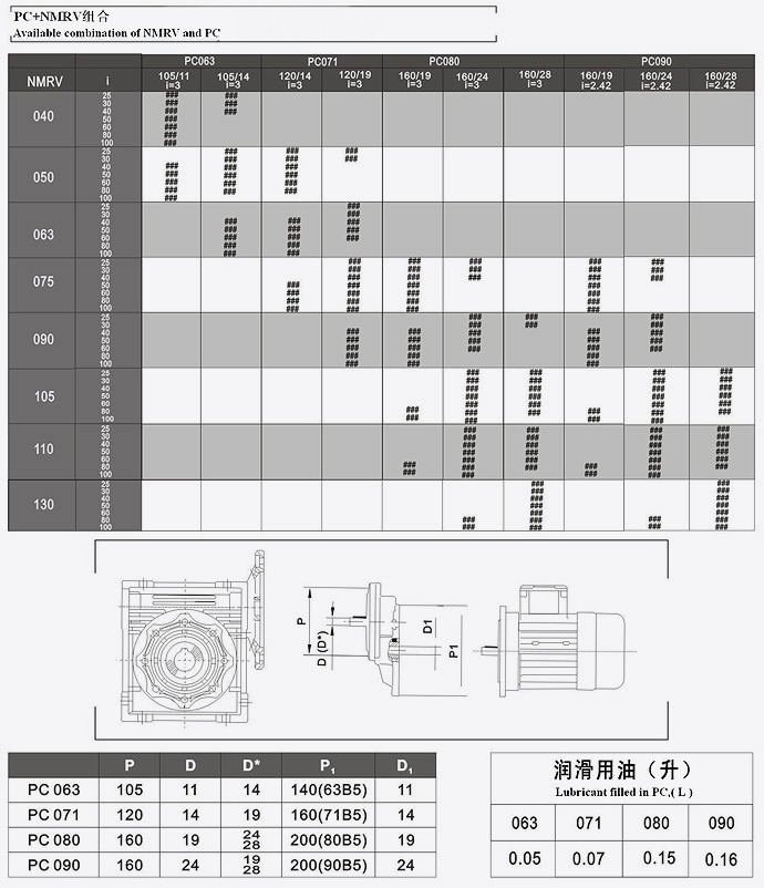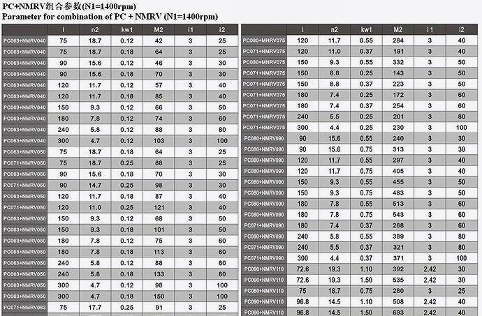 NMRV+PC組合參數(shù)表