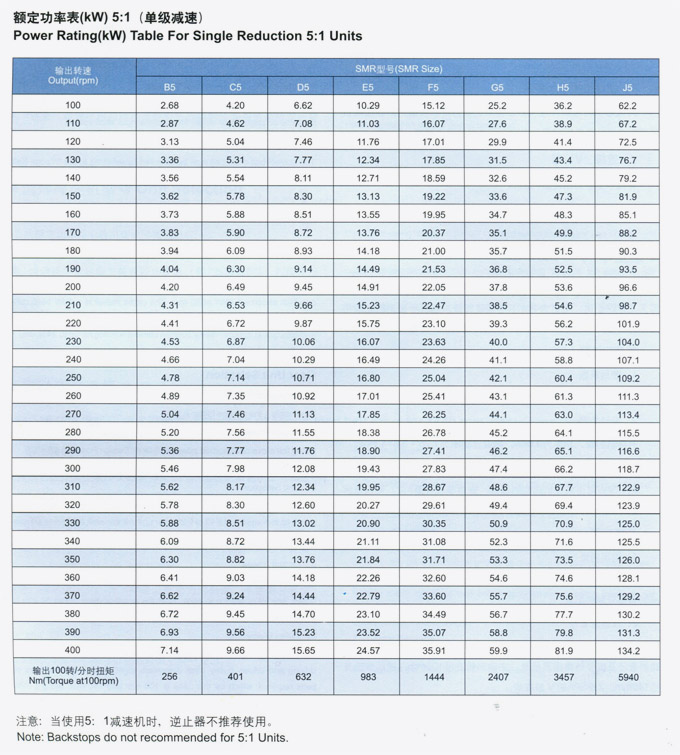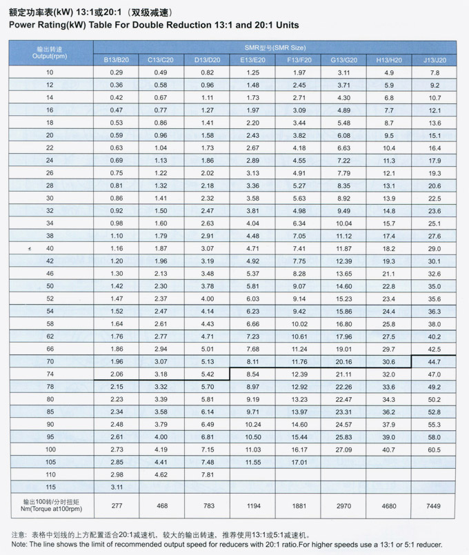 SMR公制軸裝式斜齒輪減速機額定功率表
